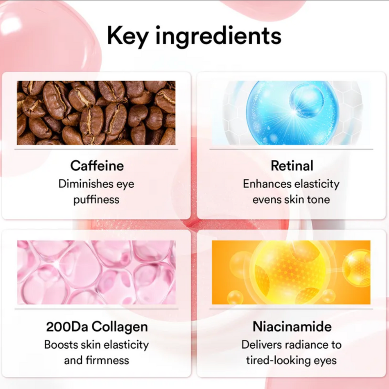Infused with Caffeine to reduce puffiness, Retinal and 200Da Collagen to enhance elasticity, and Niacinamide to add a radiant glow to dull under-eyes.